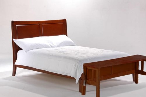 From our sister division, PlatformBedsPLUS, the Saffron is available in Cherry, Natural, and Dark Chocolate finishes. The rails, footboard, and slat support system are constructed of solid hardwood construction. The plantation-raised, kiln-dried rubberwood used in this design is very dense and the hand-rubbed finish yields a piece that is ultra smooth to the touch. Rubberwood is an eco-friendly alternative to conventional hardwoods that still maintains resistance to shrinking, warping, and cracking; as well as having a scratch resistance and hardness similar to more conventional hardwoods. This bed is designed to be used with or without a box spring. The bed also comes with the patented ThumNut assembly system allowing for easy set-up and has a Limited 10-year Manufacturer's Warranty. This bed is available in Twin, Full, Queen and Eastern King. The Twin has only one panel and the Standard King has 3 panels (not shown). The Full and Queen sizes have two panels (as shown). A picture of the other headboards currently are NOT available. Full, Queen and King sizes include a center rail with four small legs for additional support. This bed uses a standard Twin, Full, Queen, and Eastern King sized mattress and an optional box spring. Dimensions (w/o footboard bench): Twin: 42 1/2"W x 81 1/2"L x 45 1/4"H. Full: 57 1/2"W x 81 1/2"L x 45 1/4"H. Queen: 63 1/2"W x 86 1/2"L x 45 1/4"H. St. King: 81 1/2"W x 86 1/2"L x 45 1/4"H. Footboard height: 13 3/4". The unique footboard bench folds down when not in use to save space. Feel free to call us (listed in the contact us section) if you have any further questions about this bed, the materials, accessory options, or how the bed will ship to you!